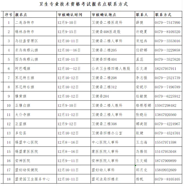 锡盟中心医院、锡盟蒙医医院、锡盟妇幼保健院和锡盟安神医院在本单位初审。其他盟直属各医疗单位、锡林郭勒职业学院医学院和锡林郭勒盟检验检测中心到盟爱国卫生服务中心进行初审。